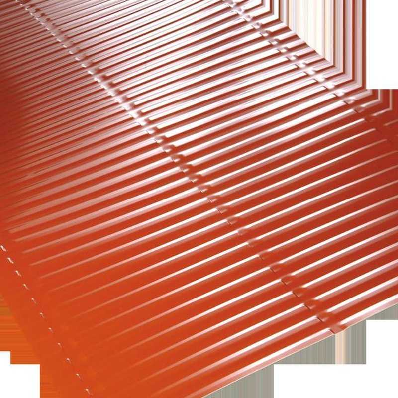 Высокого качества желоб ендовы с поперечным тиснением, с четко отмеченными местами профилирования (изгиба). Специальные углубления позволяют выполнять ручную формировку желоба кровельщиком непосредственно на крыше. Эти преимущества не влияют на твердость и жесткость желоба. Доступен в алюминиевой версии (лист или рулон) и медной (только в листах).